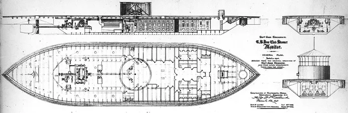 The ship looked simple enough, a raft with a gun turret in the middle. Ericsson boasted that it was secure against the heaviest shot and designed for action in shallow coastal waters like Hampton Roads and Southern rivers. He explained that even in narrow passages it could operate its guns in battle, since only the turret needed to be turned.