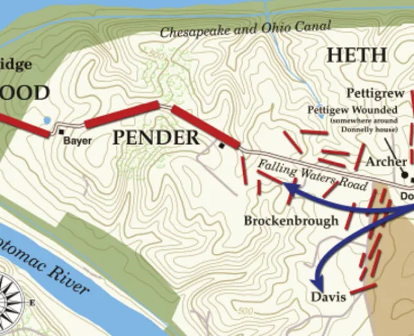 Retreating from Gettysburg after his defeat there, Gen. Robert E. Lee’s Confederate infantry reached the Potomac River ford at Williamsport, Maryland on July 8 and 9, 1863. Lee’s men could not cross, due to the rain-swollen river and loss of a pontoon bridge at nearby Falling Waters to a Union cavalry raid. On July 11, Lee entrenched in a line protecting both river crossings and waited for Maj. Gen. George G. Meade’s pursuing army to attack. On July 12, Meade reached the vicinity and probed the Confederate position. Skirmishing was heavy along the lines as Meade readied his forces for an attack. That evening, Meade held a council of war in which his corps commanders advised against moving against Lee’s formidable defenses. In the meantime, the river had fallen enough to allow the construction of a new pontoon bridge at Falling Waters, and Lee’s army began crossing the river after dark on July 13. The next morning, two Union cavalry divisions attacked the rearguard division of Brig. Gen. Henry Heth still on the east bank, taking more than 500 prisoners. Confederate Brig. Gen. James Pettigrew was mortally wounded in the fight. Lee's army was safely back in Virginia. Meade had let his best chance to destroy the Army of Northern Virginia slip away. In Washington, a frustrated Abraham Lincoln reportedly said, "We had them within our grasp." The war in Virginia would go on nearly two more years.