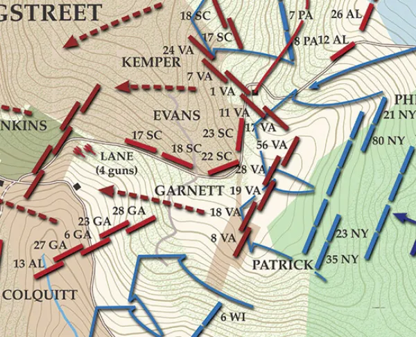 Back at Fox’s Gap, the IX Corps mounted a separate effort to seize control of Turner’s Gap but ran into stiff resistance from the Confederate divisions of John B. Hood and D. H. Hill. Casualties mounted, among them IX Corps commander Maj. Gen. Jesse Reno, who was shot down in almost the same spot as Samuel Garland had been that morning.