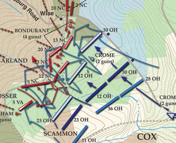 Only an undersize Confederate force commanded by Confederate Maj. Gen. D. H. Hill protected Turner’s and Fox’s Gaps. Early on September 14, Brig. Gen. Jacob D. Cox’s division of the Union IX Corps launched an attack against Brig. Gen. Samuel Garland’s Tarheel brigade at Fox’s Gap. Cox’s Ohioans overran Garland’s North Carolinians, driving the Southerners from behind a stone wall and mortally wounding Garland. With Fox’s Gap now clear, Cox awaited reinforcements to further his gains.