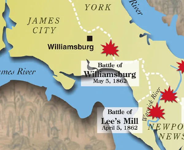 In the early spring of 1862, McClellan and the Army of the Potomac launched a campaign to capture the Confederate capital at Richmond. McClellan landed his force at Fort Monroe and moved up the Virginia Peninsula. Initially, McClellan’s army was stopped by Confederate forces at Yorktown, which resulted in a month-long siege. On May 4th, the Confederates abandoned Yorktown and withdrew toward Williamsburg.