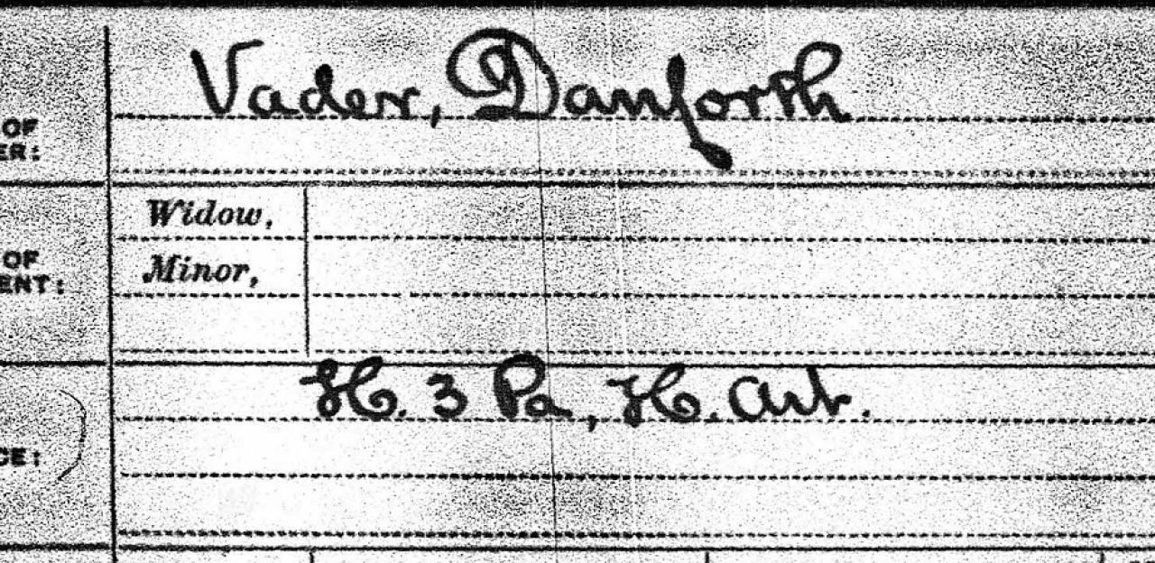 While we haven’t been able to find any Skywalkers, Chewbaccas, or R2D2s, we know of at least 29 Civil War soldiers with the surname of “Vader.” Fittingly, none of the Vaders from our galaxy were rebels. What’s more, four of them had the initials “D. Vader.” Among them were Danforth Vader, who served in Company H of the 3rd Pennsylvania Heavy Artillery, and David Winslow Vader, who managed to survive imprisonment at Andersonville.
