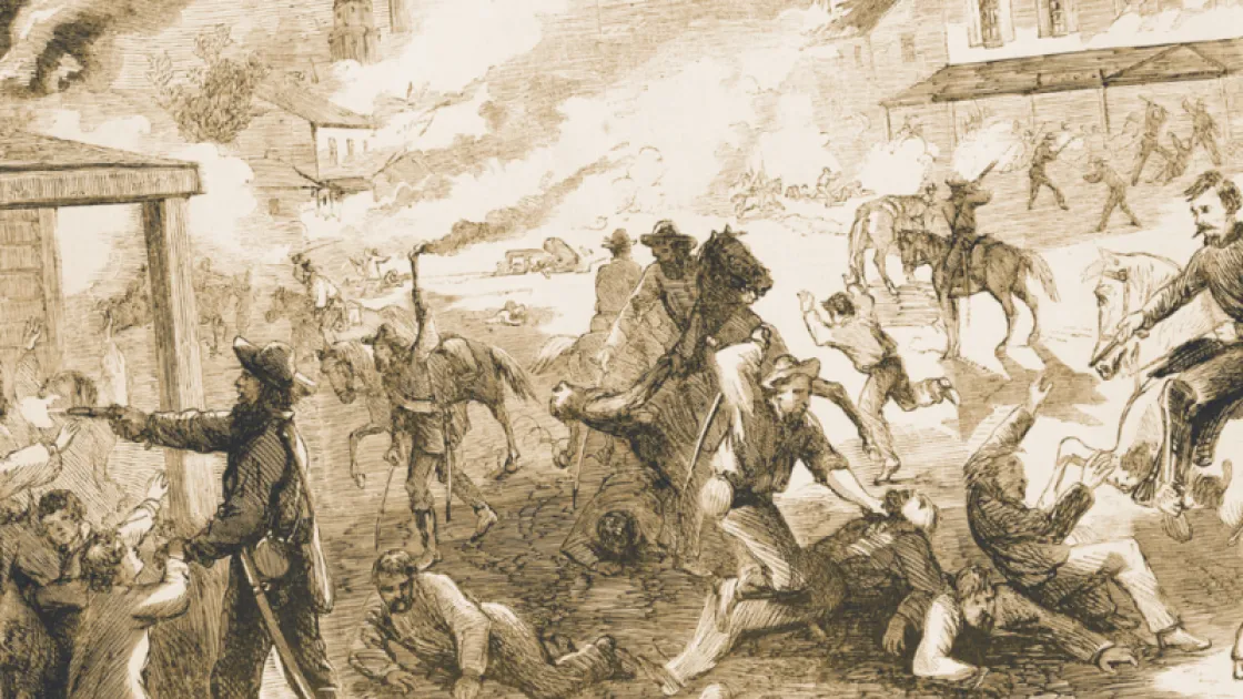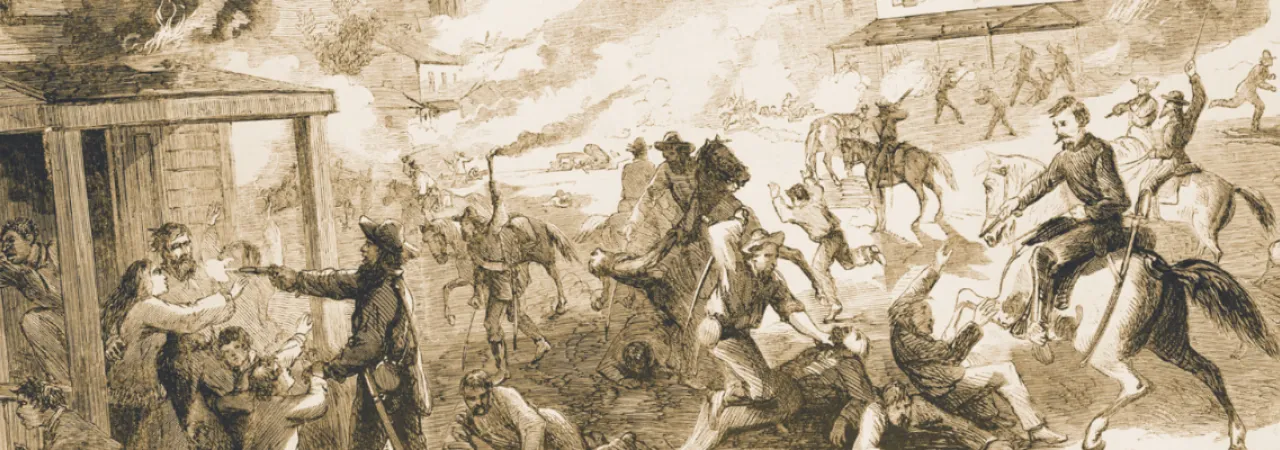 Responding to this threat, Union Brig. Gen. Thomas Ewing, commanding the District of the Border, issued a general order that any civilian aiding the raiders would be arrested, including women and children. When a jail housing some of these prisoners collapsed in August 1863, killing five women — including the 14- year-old sister of one of Quantrill’s most trusted lieutenants — Quantrill and company organized several partisan groups for a combined raid on the Kansas town of Lawrence, killing nearly 200 men and boys.
