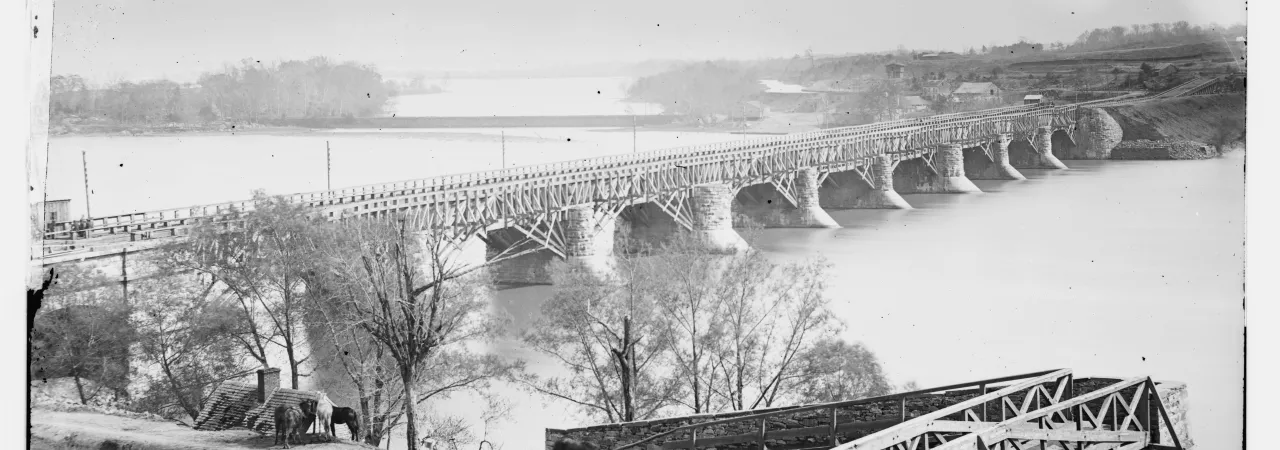 "Washington, D.C. Closer view of Aqueduct Bridge, with Chesapeake and Ohio Canal in foreground." by George N. Barnard, 1862-65.