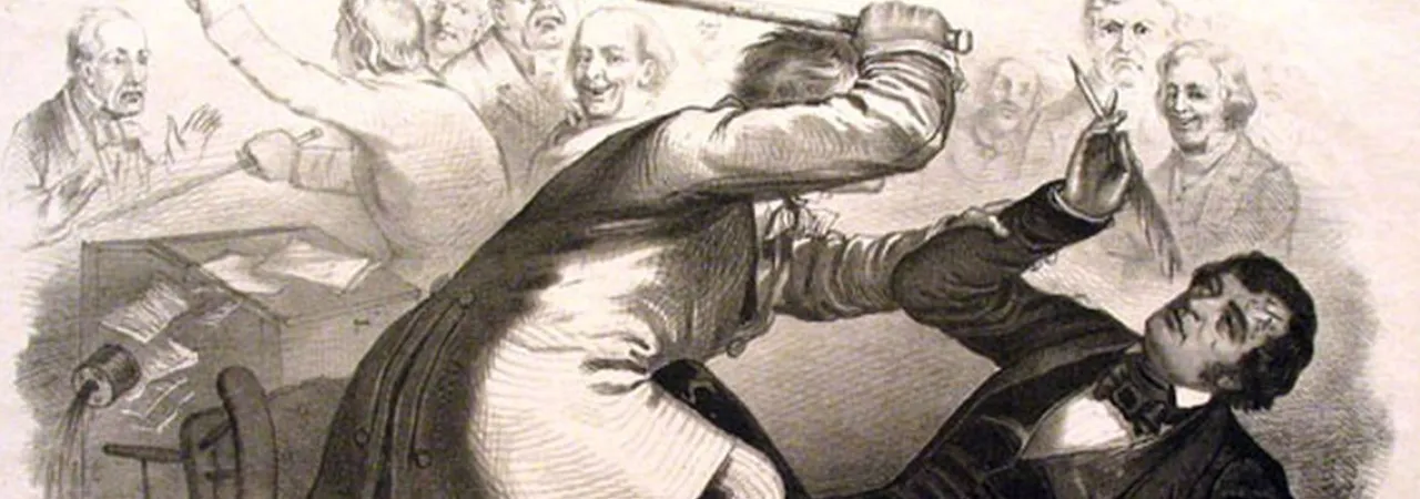 Newspaper headlines shocked readers in late May 1856 with descriptions of a violent attack within the United States Capitol Building. Preston S. Brooks had nearly bludgeoned Charles Sumner to death. “Cowardly assault upon Senator Sumner,” declared the Hartford (Connecticut) Courant. The Edgefield (South Carolina) Advertiser simply referred to the incident as “Mr. Brooks’ chastisement of Senator Sumner,” while an Alabama newspaper opined, “Sumner has been needing something of the sort since the first day he put his foot into the Senate chamber.” The wide variety of reactions illustrated the growing sectional differences and foreshadowed the rising violence that culminated five years later with the outbreak of the American Civil War.