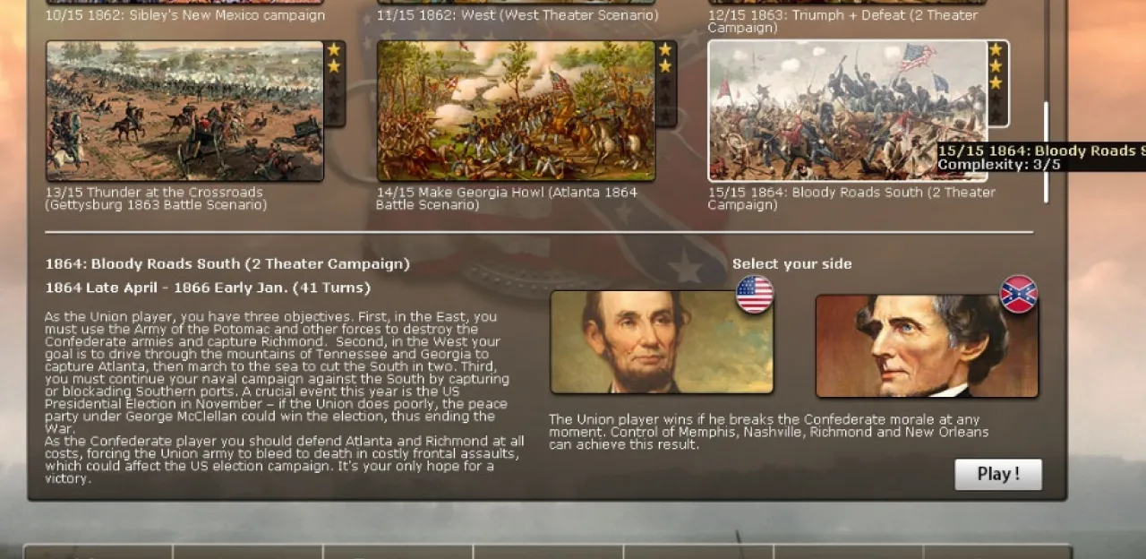 The game is not a replay of the Civil War, it lets you take the role of the president of the CSA or Union and see what could have happened. That’s what makes it so exciting!