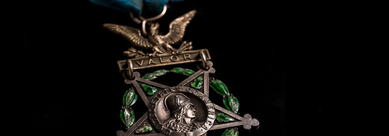 Original medals were suspended from a flag-like red, white and blue ribbon that could be pinned to the breast of the recipient by an anchor wrapped with a length of rope. The design featured a ring of 34 stars and an illustration of the Roman goddess of war, Minerva, dispelling the figure of Discord. The reverse was inscribed with the words “Personal Valor” and featured an open area where the recipient’s information would be engraved.