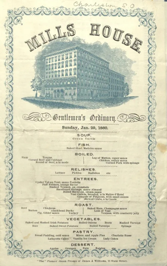 As you descend the grand marble staircase and settle into your comfortable chair in the elegant dining room of the Mills House on Sunday, January 29, 1860, you take satisfaction at having reached a station in life that allows you to indulge in some Old South luxury in Charleston, South Carolina. This famous hotel is billed as “the finest hotel south of New York City” and you hope your dinner measures up. Yes, the political scene is becoming ever more tense, but things have settled down since they hung ol’ John Brown last month after his raid at Harpers Ferry. It looks to be business as usual in Dixie in 1860, and indeed it will be, with many of the 3.84 million bales of cotton to be produced this year shipped to Europe from this busy and prosperous Atlantic port. Ah, but what shall it be for dinner today? The green turtle soup sounds sumptuous. Will it be the baked shad with madeira sauce or the “escolloped shrimps, sauce almand”? Or perhaps “compote of Pidgeons, with small onions.” And then your eye spots the corned beef and cabbage, which ignites a yearning for more basic fare. With a fine selection of vegetables, pastries and desserts, including “Lafayette Cake” (gingerbread cake), you’ll probably need to hold the handrail as you climb to your room on the fifth and top floor, especially if you tapped into the hotel’s extensive wine list, which includes a nice selection of fine French wines from New York City’s leading wine merchants. Enjoy the peace of this pleasant winter Sunday in the South because it won’t be around much longer. Come December, South Carolina will secede from the United States. The vote will be taken just blocks away at Institute Hall. The bombardment of Fort Sumter in April 1861 and the start of the war will be a sight to see, but it will be followed by the disastrous Charleston fire of December 1861, which will leave a massive swath of destruction through the heart of the business district, destroying some 600 buildings. It will burn right up to the Mills Hotel and scorch the north side of the building. Guests, including Robert E. Lee, will be forced to flee the flames and brave hotel workers will hang wet blankets from the windows and extinguish falling embers to keep them from igniting the roof. During the 545-day bombardment of Charleston in 1863-65, the Mills House will receive at least 13 direct hits, and will close its doors. But it will survive the war, reopen and continue as a leading Charleston hotel into the 21st century.