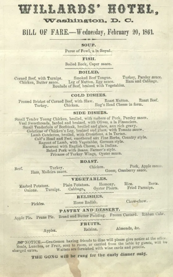 At Willards’, the extensive bill of fare includes a wide range of “Side Dishes” such as ”Lamb Cotelettes, broiled, with Croustons, a la Tartan,” and “Calf’s Head and Feet, smothered aux Fine Herbs, Country style,” as well as “Baked Pork with Beans, Farmer’s style.” If you desire a meal that will continue to be popular for centuries to come, you ask for “Macaroni with English Cheese, a la Italian.” Vegetable choices include “Homony” and “Fried Parsnips.” For dessert, the “ribbon cake” sounds interesting. Three days hence, on Feb. 23, Lincoln will arrive in Washington and make his way to this very hotel, which will immediately become jammed with visitors and well-wishers. And on March 4, after his inauguration at the Capitol, Lincoln will proceed not to the White House, but to Willards’ for a luncheon that featured mock turtle soup, corned beef and cabbage, parsley potatoes and blackberry pie.