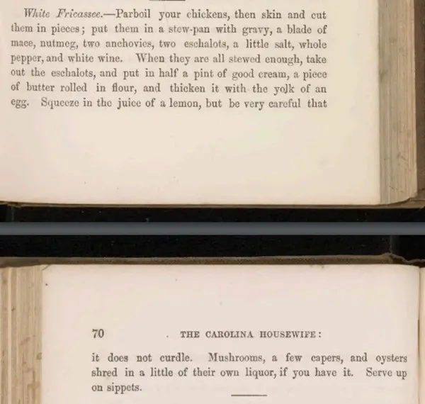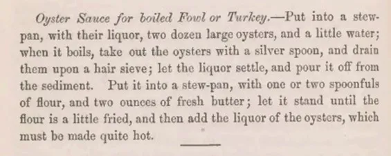 Turkey Fricassee in Oyster Sauce from The Carolina Housewife (pages 69 and 76)
