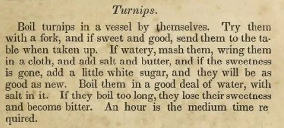 Mashed Turnips from Miss Beecher's Domestic Receipt Book (page 73)
