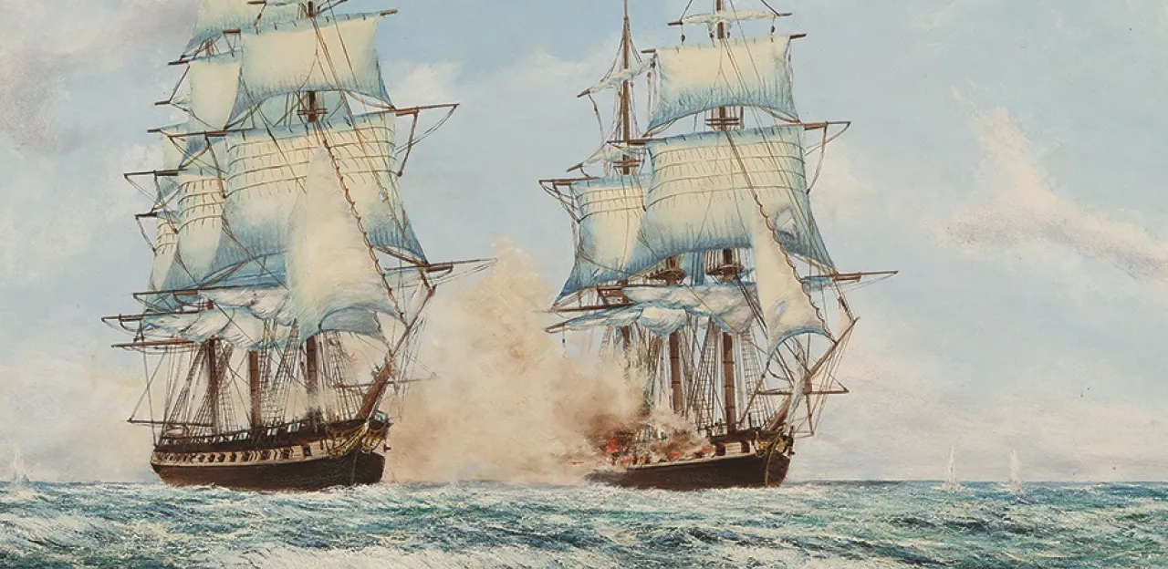 Isaac Hull in Constitution, having avoided capture at the onset of the war, slipped out of Boston early on August 2. On the afternoon of August 19, Constitution spotted and closed on the British frigate Guerriere. For more than two and a half hours Constitution and Guerriere slugged it out. The carnage was horrendous. In the midst of the battle, an American seaman is reported to have seen a British ball strike Constitution’s side and fall harmlessly into the water. Upon which he yelled, “Huzzah, her sides are made of iron!” earning the ship her perpetual sobriquet, “Old Ironsides.” At about 6:30 p.m., the British warship struck her colors.