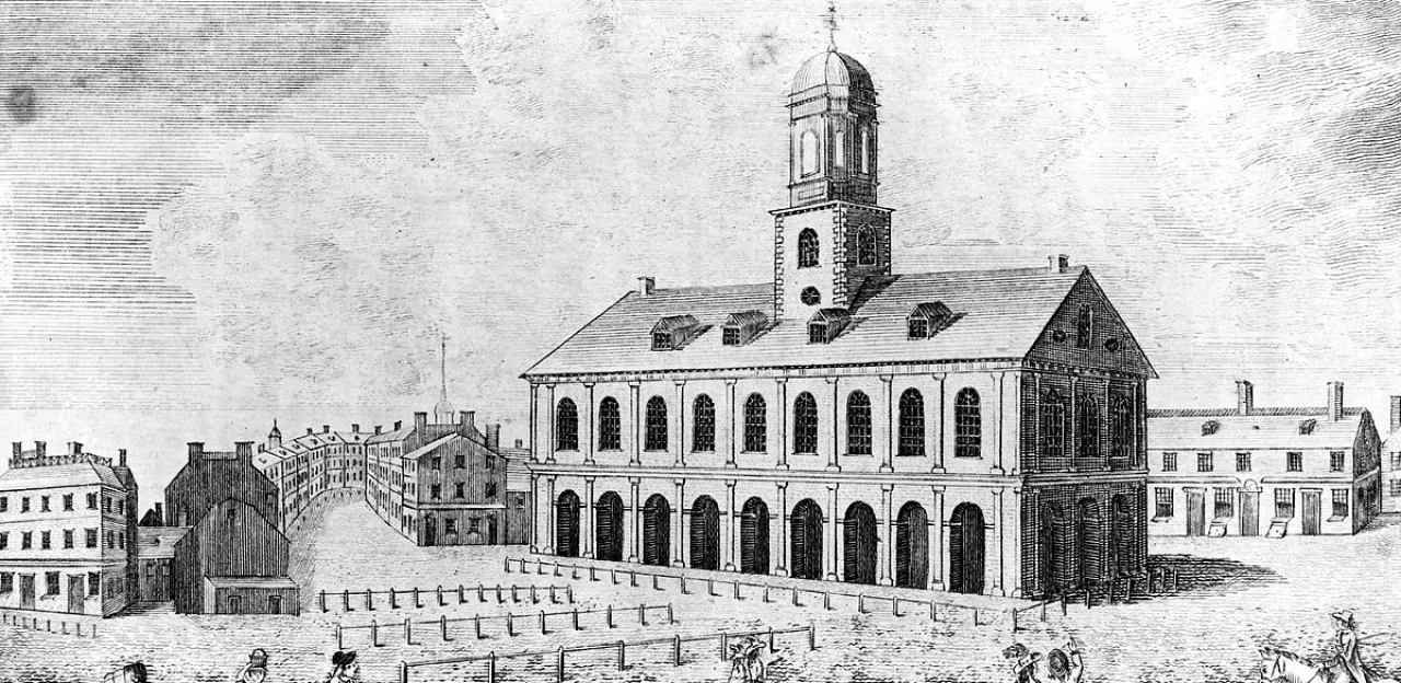 Often referred to as “The Cradle of Liberty,” Faneuil Hall is a marketplace and meeting hall where many of the debates and discussions about American liberty occurred throughout the 18th and 19th centuries. Faneuil Hall was a gift to the city of Boston from the wealthy merchant Peter Faneuil, who it was named after. The massive hall was completed in 1742 in Dock Square in downtown Boston. The first floor of the building was a marketplace and above it was placed a meeting hall. Some of Boston’s townspeople were suspicious of centralizing the town’s market, but the ultimately accepted it by a slim margin of seven votes and Boston’s town meeting hall was moved into Faneuil Hall. The hall was gutted by a fire in 1761 but reopened in 1763.
