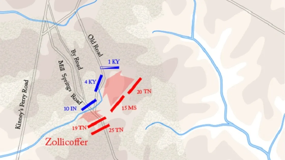 Zollicoffer led from the front, giving most of his attention to the 19th Tennessee on the far left of his line, and was thus unable to coordinate an overwhelming, all-in-at-once assault that almost certainly would have broken through the Union roadblock on impact. His remaining regimental commanders were left out of his sight and without specific orders, resulting in piecemeal attacks that did not take full advantage of the brigade’s numerical superiority.