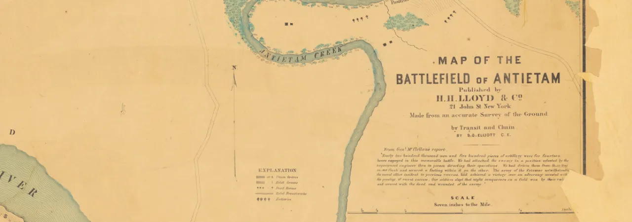 S. G. Elliott's Map of the Battlefield of Antietam amounts to a burial map of the Union and Confederate dead — even their horses are mapped. While this map was created in 1864, just like famous one for the Gettysburg battlefield, it lay in in the New Public Library's collection, unknown to most scholars, until recently. It was digitized in 2018 and uncovered by historian Timothy H. Smith and Andrew Dalton, Executive Director of the Adams County Historical Society in Gettysburg, Pennsylvania.