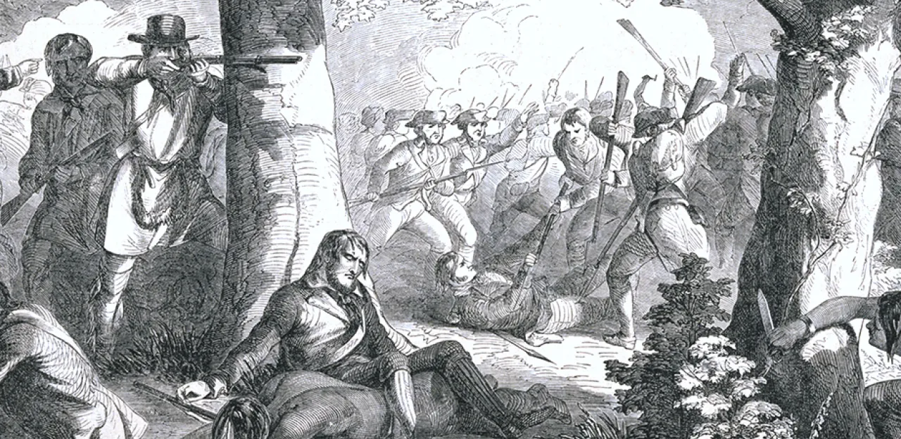 At 10 am, the American column moved into the ravine, with Herkimer mounted near the front. Johnson wanted the Americans to run headlong into his Loyalists, and then have the Natives swoop in to decimate the column trapped in the ravine. Instead, some of the natives at the rear of the American column opened fire preemptively. As a result, the portion of Herkimer’s men who were outside the ambush zone quickly fled, pursued by Mohawks for miles. Herkimer himself was struck in the leg. His men laid him against a tree, but when they suggest he retire to the rear he replied, “I will face the enemy” and calmly sat directing the battle.