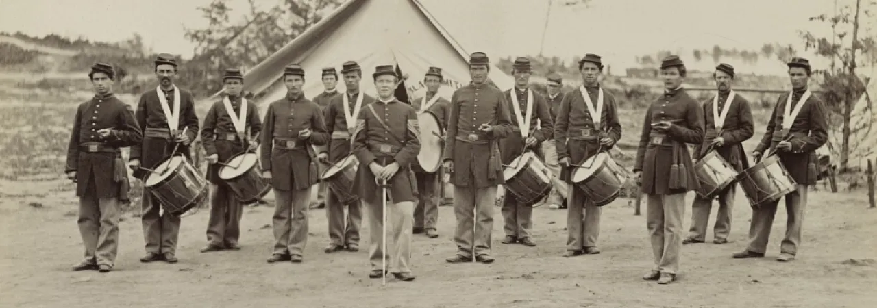 Percussion instruments are other well known instruments of Baroque and Classical eras. Originally, percussion instruments were designed to be played indoors in the small ensemble and orchestral settings. However, the use of percussion instruments became popular during the American Revolution and the American Civil War. Utilizing percussion instruments allowed for ease in the movement of troops, daily drill, and commands on and off of the fields. Field drums of the American Revolution and American Civil War are easily identifiable by certain characteristics. These characteristics include a wooden frame and top and bottom “heads” made of calfskin or sheepskin which were then stretched over the frame. To create tension and to assist with tuning, ropes were laced through holes drilled into the wooden frame. Additionally, four to six strands of catgut or rawhide were stretched across the bottom center of the drum head to create snares. Musicians used wooden sticks or beaters to play both the snare and bass drums. Drummer boys of the American Civil War have become one of the more iconic musicians from these two periods of music. And although Archibald Willard’s “The Spirit of ‘76” catapulted the drums and fife into the American imagination as the driving military music and instruments of the American military during the Revolution, it was another instrument family that drove those same sentiments during the American Civil War.