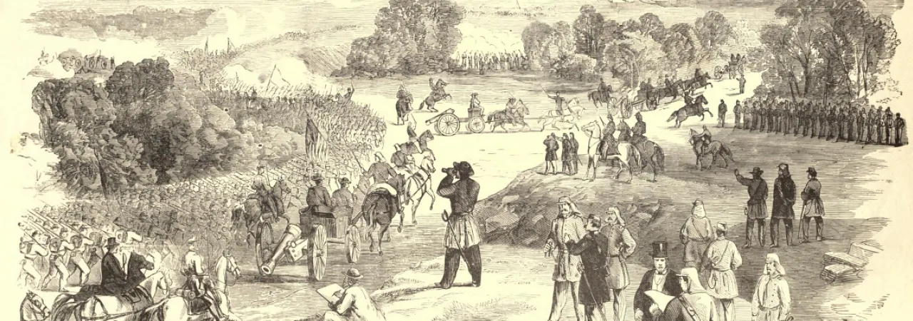It is a popular, almost legendary, story that innumerable civilians armed with picnic baskets followed the Union Army out from Washington in July 1861 to watch what everyone thought would be the climactic battle of a short rebellion. These naïve citizens, the tale goes, then impeded the Union retreat, adding to the panic. Hollywood representations of Manassas have, unfortunately, perpetuated the notion that large numbers of civilians were actually under fire on the battlefield. Indeed, there were a few, like Gov. William Sprague of Rhode Island, who accompanied Burnside’s brigade and had two horses shot from under him on Matthews Hill. The majority of spectators, however, were well out of harm’s way on Centreville Heights, some five miles from the fighting.