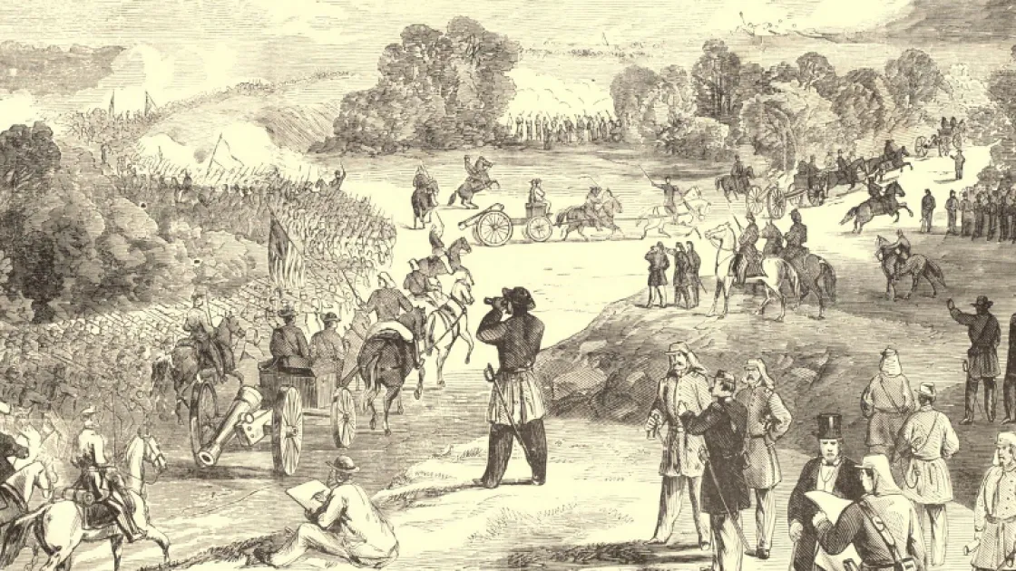 London Times correspondent William Howard Russell observed, “On the hill beside me there was a crowd of civilians on horseback, and in all sorts of vehicles, with a few of the fairer, if not gentler sex .... The spectators were all excited, and a lady with an opera glass who was near me was quite beside herself when an unusually heavy discharge roused the current of her blood —‘That is splendid, Oh my! Is not that first rate? I guess we will be in Richmond to-morrow.’ Irritated by constant appeals to borrow his glass, Russell decided to press forward after an officer rode up and exclaimed to the cheering crowd, “We have whipped them on all points.”