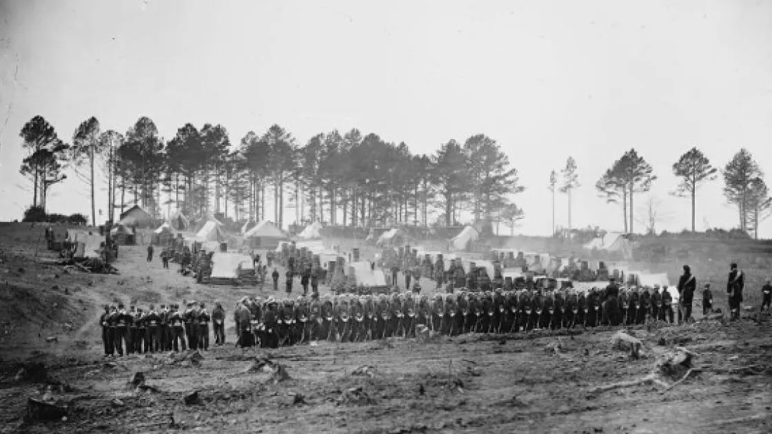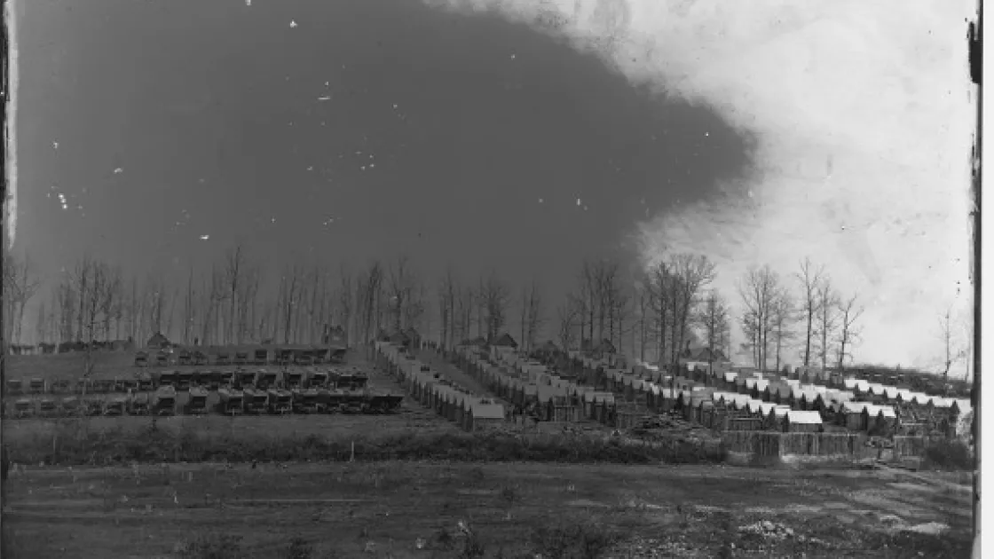 The Philadelphians of the 114th Pennsylvania, in their Zouave uniforms, were among the most colorfully attired soldiers in the Union army. After being bloodied at Fredericksburg and Gettysburg, they settled in to quarters near Brandy Station. In the spring of 1864, the band at left played for the assembled troops.