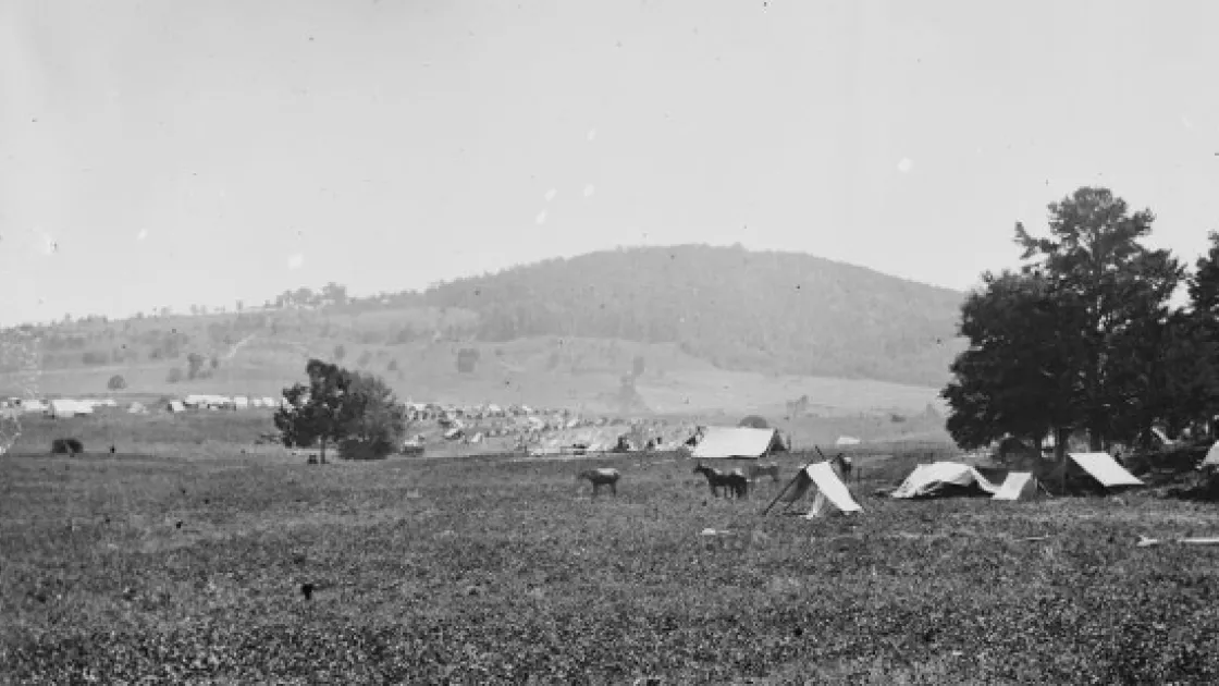 Stonewall Jackson moved north, the rest of the Confederate army close behind. This campaign resulted in two decisive Confederate victories -- Cedar Mountain and Second Manassas. Here, Union camps sit in the shadow of Cedar Mountain.