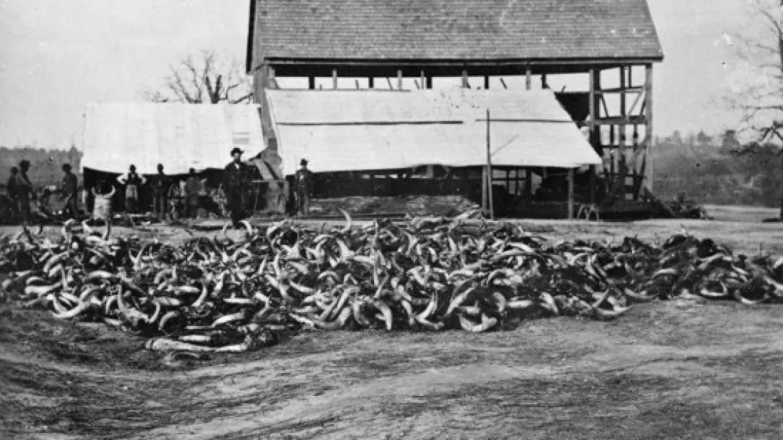 Feeding the armies required entire herds of cattle. Slaughtering, butchering and distributing beef was a massive operation. The horns of hundreds of cattle were piled at army slaughterhouses, like this one at Cedar Level.