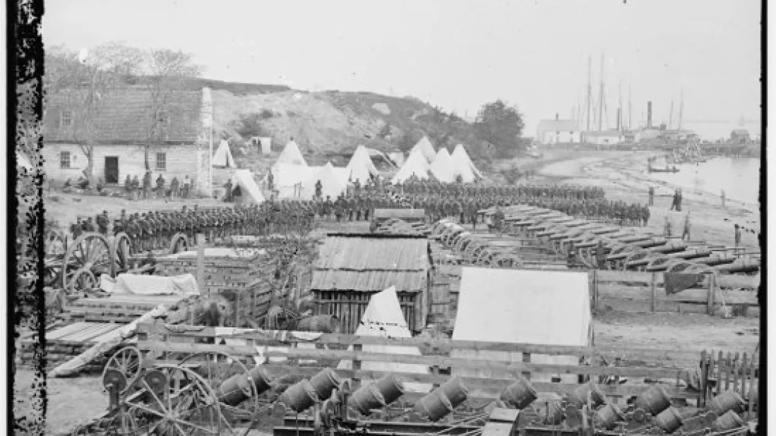 Transporting and distributing supplies required depots at various ports. These Union troops gathered near a massive artillery park at Yorktown. Note the ships at the dock in the background.