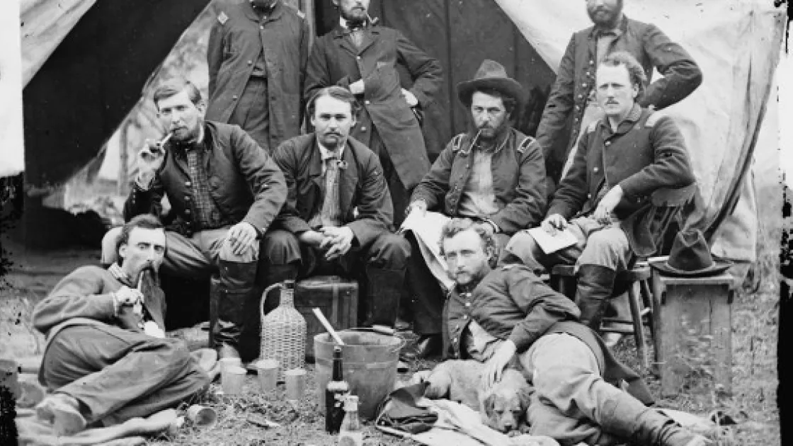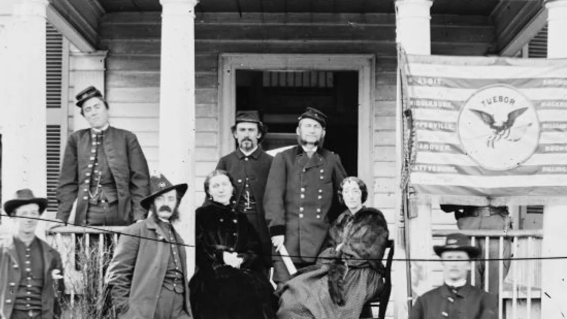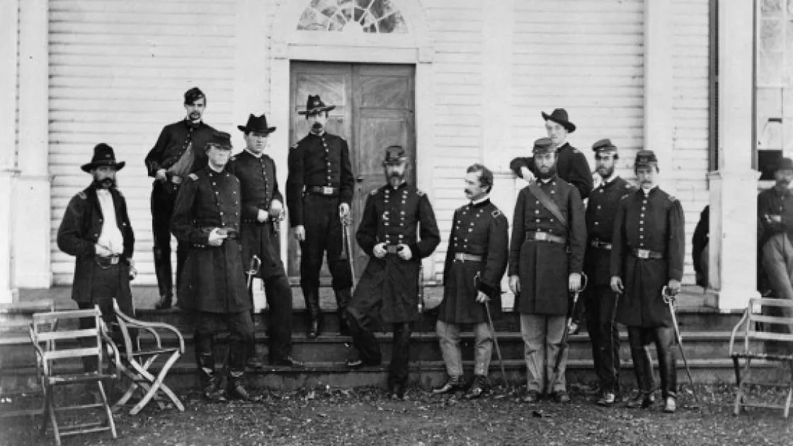 In February 1864, Maj. Gen. Judson Kilpatrick and Col. Ulric Dahlgren led a cavalry force to sack Richmond and free Union prisoners. Dahlgren was killed in the raid but Kilpatrick's command escaped intact. Shortly before the raid, Kilpatrick (standing, center), his staff, and several unknown ladies posed with the division flag.