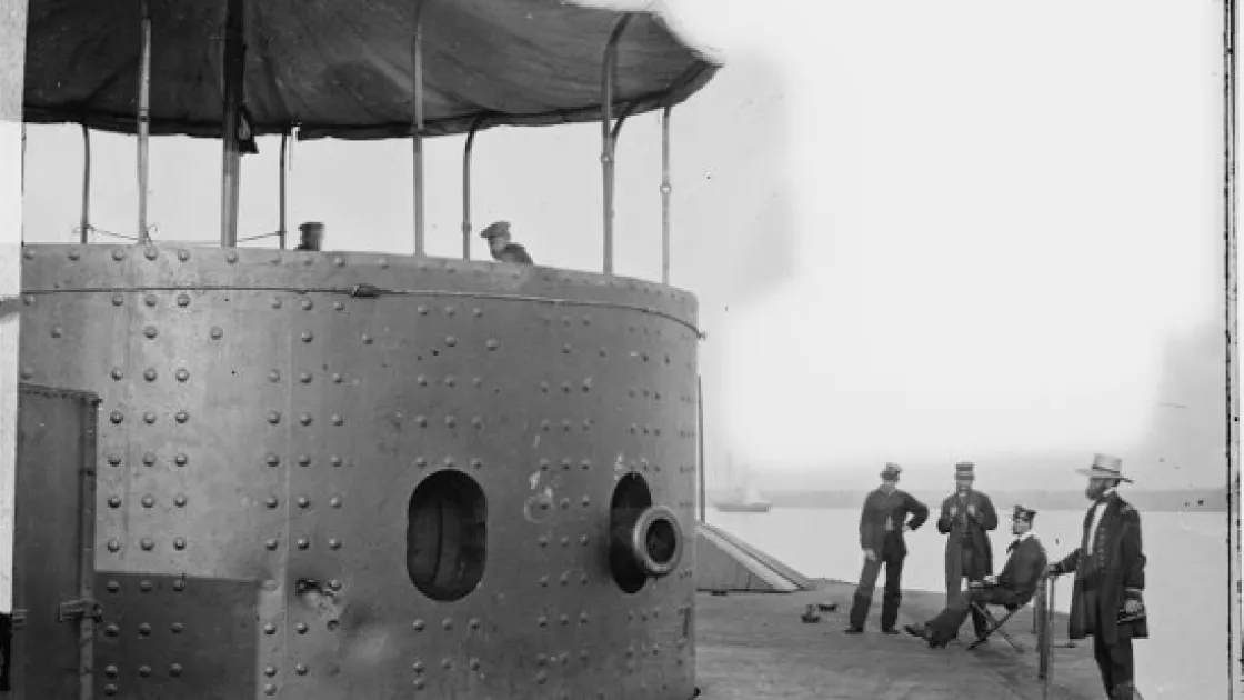 No photographs were made of the CSS Virginia before she was scuttled and only a few were made aboard the USS Monitor before she too was lost. This image of the Monitor clearly shows the damage her turret took in combat.