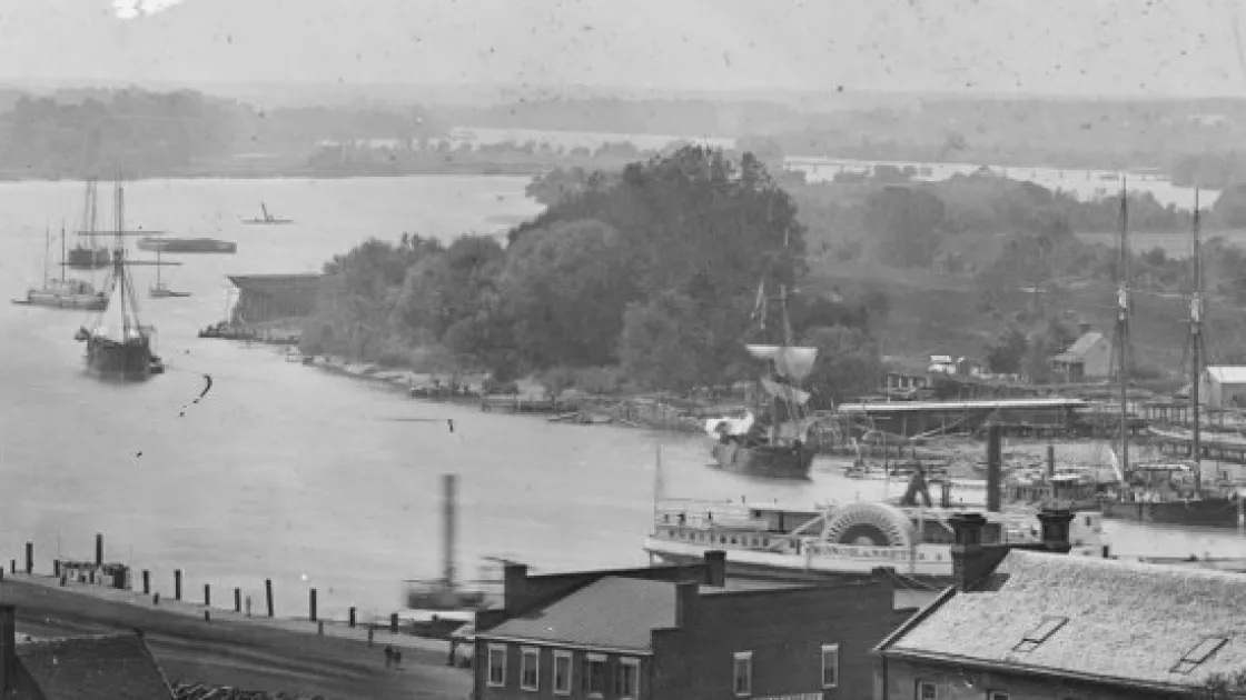 Confederates turned Richmond's Rocketts Landing into their primary shipyard. This detail of an 1865 photograph shows the former shipyard area and two unfinished vessels -- one of them an ironclad (at middle right) as well as the many varied Union vessels now crowding the channel.