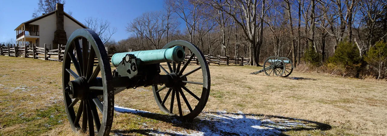 Overwhelmed in front and on both flanks, the Union regiments around Elkhorn Tavern fell back through a maze of fences and outbuildings. Now the only Union presence was a hodgepodge of guns from different batteries arrayed in a semi-circle on Telegraph Road. The artillerymen worked frantically to limber up their weapons and escape. In a final act of defiance they fired a ragged salvo of canister into the faces of the oncoming Confederates. Stunned survivors of the murderous blast stumbled forward and captured two of the smoking guns, but the Federals took advantage of the chaos and rolled to safety with all of their other guns and caissons.