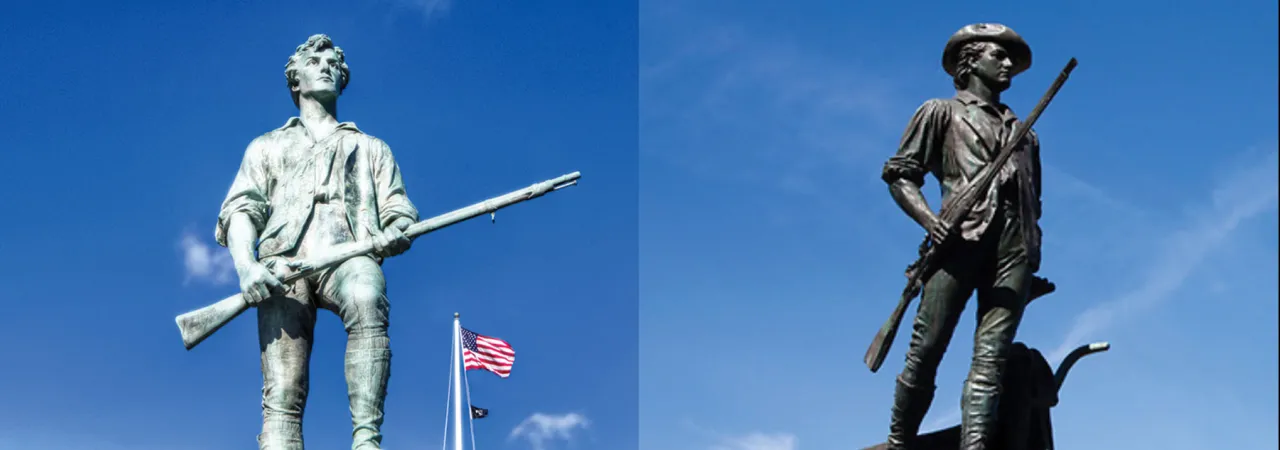 LEFT: The Lexington Minute Man statue by by Henry Hudson Kitson, Lexington, Mass.; RIGHT: Minute Man statue by by Daniel Chester French, Concord, Mass.