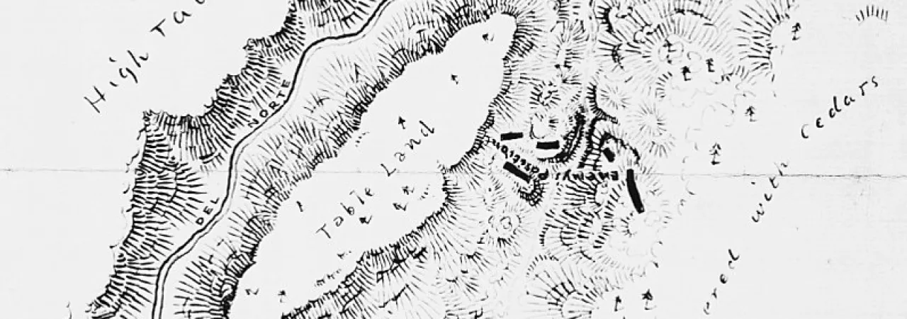 Responding to the popular insurgency called the Taos Rebellion, Colonel Price’s force, which included elements of the First Dragoons and 2nd Regiment Missouri Mounted Volunteers, confronted New Mexicans near a mountain pass known as El Embudo. According to Price, the rebels occupied a “very strong” position behind “dense masses of cedar and large fragments of rock.” As the Americans flanked the enemy, the New Mexicans retired “with a speed that defied pursuit.” After the Americans easily captured the town of Embudo, they moved on to Pueblo de Taos where they engaged New Mexicans in one of the final battles of the Taos Rebellion.