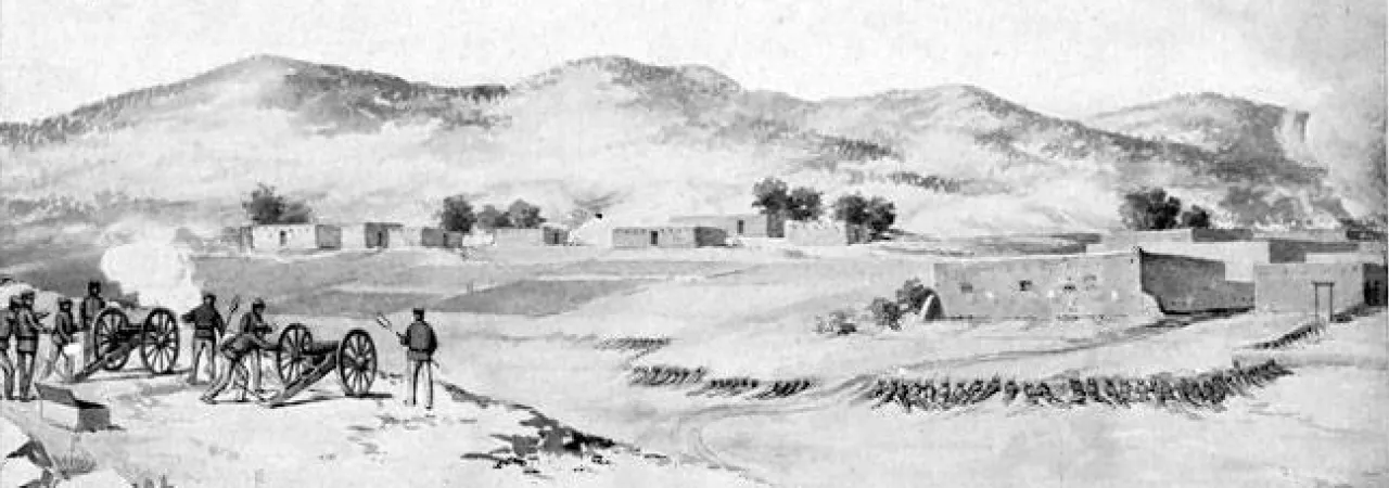 The battles around Mora were a local response to the American invasion of New Mexico called the Taos Rebellion. Following the January 19 assassination of Governor Charles Bent in nearby Taos, Captain Israel R. Hendley of the Second Missouri Volunteers led a force of 250 men and captured the settlement of Las Vegas where the rebels were gathering. A few days later, Hendley and eighty men marched to Mora, while the remaining Americans remained at Las Vegas. In Mora, the Americans found a much-larger Mexican force “prepared to defend their town.” In the subsequent house-to-house fighting, Hendley was killed. Although the Mexicans suffered greater casualties, the Americans retreated to Las Vegas with a handful of prisoners and reported having slain up to twenty New Mexicans. A week later the Americans returned to Mora to avenge Hendley’s death.