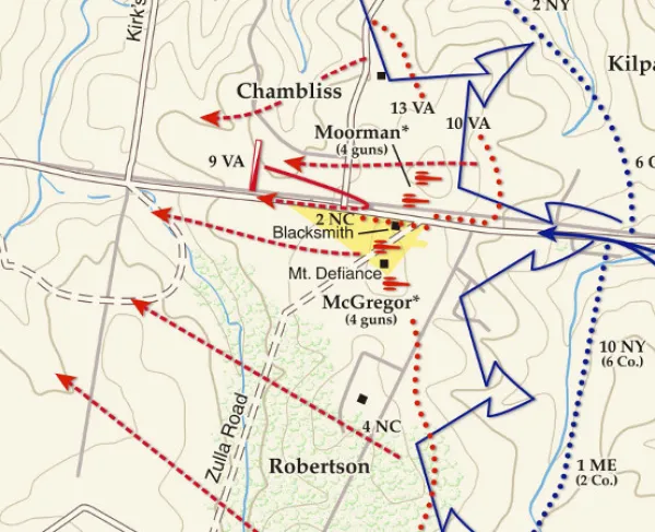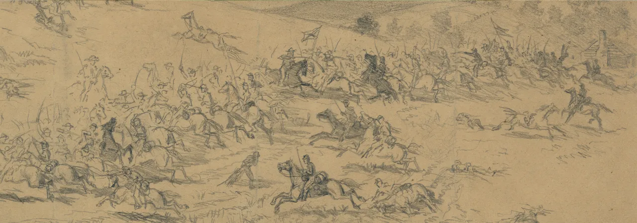 Jeb Stuart’s cavalry screened the Confederate infantry as it marched north behind the sheltering Blue Ridge Mountains. The pursuing Federals of Brig. Gen. Judson Kilpatrick’s brigade, in the advance of Brig. Gen. David Gregg’s division, encountered Col. Thomas T. Munford’s Virginia troopers near the village of Aldie on June 17, 1863, resulting in four hours of stubborn fighting. Both sides made mounted assaults by regiments and squadrons. Kilpatrick was reinforced in the afternoon, and Munford withdrew toward Middleburg where the battle would continue the next day. The battles at Aldie, Middleburg and Upperville along the Ashby's Gap Turnpike successfully delayed the Union cavalry thrust across the Loudoun Valley, preventing them from finding Lee's army.