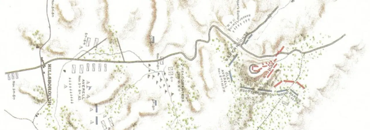 Averell's column of nearly 5,000 men left Beverly, West Virginia, on November 1st and met no enemy for the first few days of the raid. On November 3rd, Duffie's column left Charleston and moved towards Lewisburg. By November 4th, Averell's men ran into elements of William L. Jackson's command near Hillsboro. After the skirmish, Jackson informed Echols of the Federal advance. After fighting a series of delaying actions, Jackson's command fell back to the summit of Droop Mountain on the 5th, just outside of Hillsboro. After receiving word of the need for reinforcements, Echols moved his brigade towards Droop Mountain. After a long night march, Echols men arrived in the area early on November 6th. Seeing that the Federals could potentially use the road from Fallings Springs to Hillsboro to attack the Confederate right and their route of escape, Echols left a small force to defend the road.