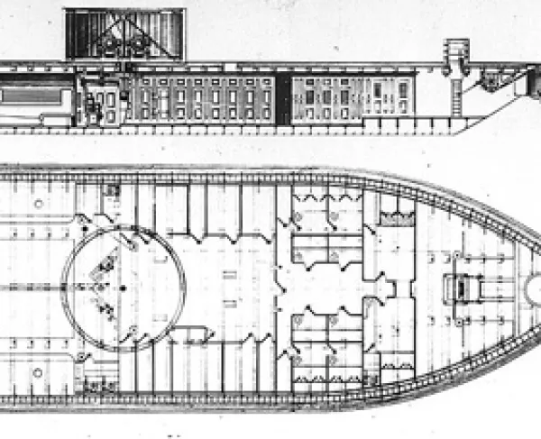 The Monitor had a round, rotating gun turret on her deck. The iron turret housed two Dahlgren guns, installed side by side. Innovative in design as well as in construction, the Monitor had components and attributes that were later echoed in submarine design. Her armored deck, 172 feet long and 41.5 feet at the beam, rode just 18 inches above the waterline and extended beyond the hull, which was only 5/8-inch thick and thus nearly submerged for protection against cannon fire. On the deck with the gun turret was a small pilothouse and a detachable smokestack. The turret was made from eight layers of 1-inch iron plate bolted together. A ninth plate within the turret provided a sound barrier.