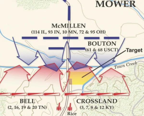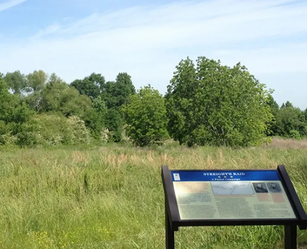 The Battle at Hog Mountain was one in a series of skirmishes fought between a Union force moving through northern Alabama against 500 Confederate cavalrymen under Maj. Gen. Nathan Bedford Forrest. Led by Colonel Abel D. Streight, the raid took place from April 19 to May 3, 1863 in northern Alabama. Streight's force consisted of four infantry regiments and two companies of Tennessee cavalry. His goal was to destroy the Western and Atlantic Railroad, which was supplying Gen. Braxton Bragg's Army of Tennessee. Near Hog Mountain on the evening of April 30th, Forrest led the 4th and 9th Tennessee Cavalry regiments in charge after charge against the numerically superior Union force. Much of the fighting was hand-to-hand and in the dark. Four Union artillery pieces, captured earlier in the raid, supported the infantry. A Confederate flanking movement ultimately threatened the Union rear and Streight ordered his men to retire. The raid was poorly supplied and planned, and ended with the defeat and capture of Streight and his 1,700 exhausted men at Cedar Bluff, Alabama, by Forrest who had 500 men. Streight was hindered by locals throughout his march while being pursued by Forrest, who had the advantage of home territory and the sympathy and aid of the local populace.