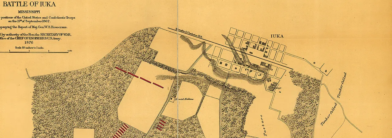 Maj. Gen. Sterling Price’s Army of the West main column marched into Iuka, Mississippi, on September 14th. Price’s superior, Gen. Braxton Bragg, had ordered Price to prevent Maj. Gen. William S. Rosecrans’s Army of the Mississippi from moving into Tennessee and reinforcing Nashville. Maj. Gen. Ulysses S. Grant, commanding the Army of the Tennessee, feared that Price intended to go north to join Bragg. Grant devised a plan for his left wing commander, Maj. Gen. E.O.C. Ord, to advance on Iuka from the west; Rosecrans’s forces were to march from the southwest, arrive at Iuka on the 18th, and make a coordinated attack with Ord the next day. After considering the amount of time that Rosecrans required to reach Iuka, Grant determined that he probably would not arrive on the 19th, so he ordered Ord to await the sound of fighting between Rosecrans and Price before engaging the Confederates. As Rosecrans advanced, his men fought actions with Confederate troops at points along the way. About 4:00 pm, fighting began, which Price later stated he had “never seen surpassed,” and continued until after dark. Ord did nothing, later proclaiming that he never heard any fighting and, therefore, never engaged the enemy; Grant also remarked that he had heard no sounds of battle. The next day, Price’s army retreated and Rosecrans’s army occupied Iuka. The Confederate rearguard and overgrown terrain prevented the Union pursuit from accomplishing much. The Federals should have destroyed or captured Price’s army, but instead the Rebels were able to join with Confederate Maj. Gen. Earl Van Dorn, with whom they would soon fight the Second Battle of Corinth against Rosecrans.