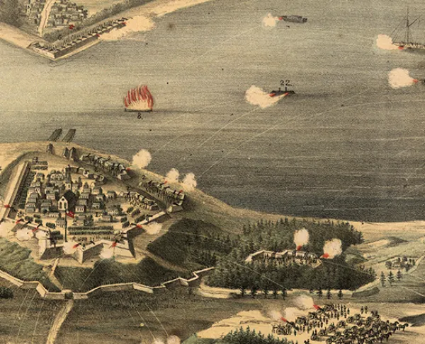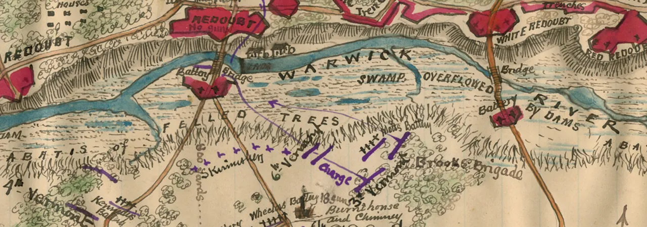 In early April, 1862, the Army of the Potomac moved up the Virginia Peninsula from Fort Monroe in two columns. On the right, the III Corps marched toward the Yorktown defenses, and on the left the IV Corps advanced toward Williamsburg. Maj. Gen. George B. McClellan planned to trap the Confederates in the two-pronged maneuver with the III Corps holding Maj. Gen. John Magruder’s forces at Yorktown while the IV Corps under Brig. Gen. Erasmus Keyes blocked their retreat toward Williamsburg. McClellan’s maps, however, incorrectly showed the Warwick River flowing parallel to the James River; he was unaware that the Warwick partially blocked Keyes’ advance. Lee’s Mill on the Warwick was defended by one brigade from Brig. Gen. Lafayette McLaws’ division and supported by the Peninsula Artillery. Brig. Gen. William F. Smith’s division led the Union advance toward the mill. Halted by the Confederate defenses on April 5, Smith deployed his three brigades under heavy fire along the Warwick. Keyes reported to McClellan that “No part of this line as far as discovered can be taken by assault without an enormous waste of life.” The battle cost few casualties, but thwarted McClellan’s maneuver plans and convinced him to besiege the Confederates.