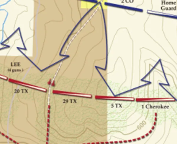 During the night, Branson requested reinforcements, and by the early morning hours, Col. Barrett himself was on the field with 200 men from the 34th Indiana Infantry, bringing the total Federal force to 500. After setting a battle plan, Barrett moved towards the ranch and hit Robinson’s outnumbered company along the river and at the ranch. After a few hours of fighting, Robinson pulled back towards Brownsville and requested reinforcements. Barrett’s men pursued only a mile from the ranch, resting his men on a small hill. At 3:00 pm, Col. John S. “Rip” Ford appeared with almost 400 men, including Robinson’s company. Ford had a greater advantage over Barrett because his column included six cannons which were deadly on the flat prairie. At 4:00 pm, Ford’s men were in position and commenced their attack. After hitting both flanks and punching the center of his lines, Barrett decided to withdraw back to Brazos Island. Ford’s men continued to pound Barrett’s lines and almost captured the entire command but were stopped when the 62nd U.S.C.T held the Federal right flank and kept the escape route open.