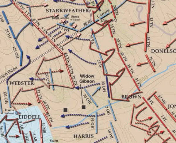 In the afternoon, the Confederate attacks opened up. Bragg planned to commit three divisions. Due to the surprise of the Confederates, the plan worked. Many Federals in McCook’s corps were inexperienced and had only been in the service for less than three months. For over five hours, McCook’s corps struggled to survive.