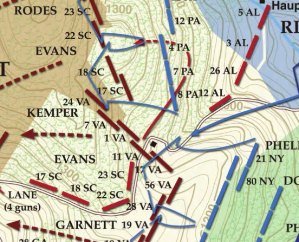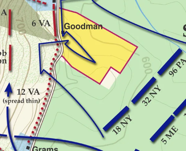 At Turner’s Gap, Union Maj. Gen. Joseph Hooker’s I Corps arrived on the steep mountainside near Frostown, and divisions under George G. Meade and John P. Hatch made relentless charges on the gap’s northern edge. After a brutal firefight along a cornfield fence, Hatch broke through the Rebel line. Only the timely arrival of reinforcements from Longstreet prevented the Confederate line from collapsing. By nightfall, the Confederates still maintained control of Turner’s Gap.