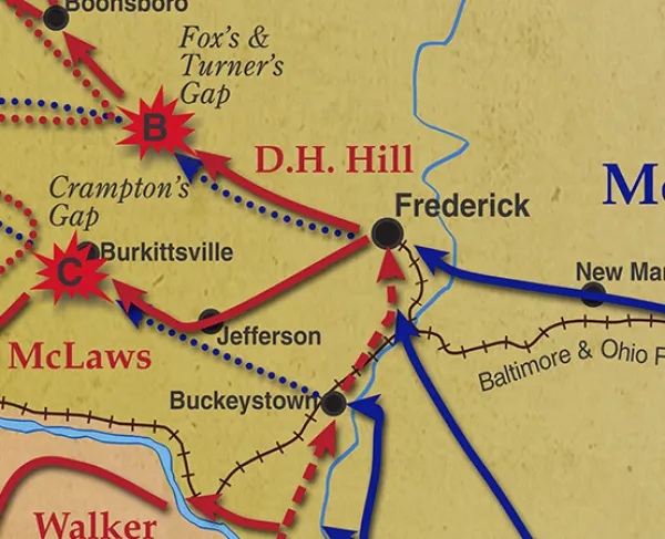 On September 13, Union Maj. Gen. George B. McClellan received a mislaid copy of Lee’s Special Order #191 that revealed the Confederate plans and objectives for the Maryland Campaign. Even though the intelligence was four days old, McClellan knew that Jackson was behind schedule at Harper’s Ferry, which was surrounded but not yet taken, and that Lee’s army was divided and separated over miles of Maryland countryside. Aware that a portion of Lee’s army was now vulnerable to attack, McClellan advanced toward the South Mountain range to attack Lee’s forces there.