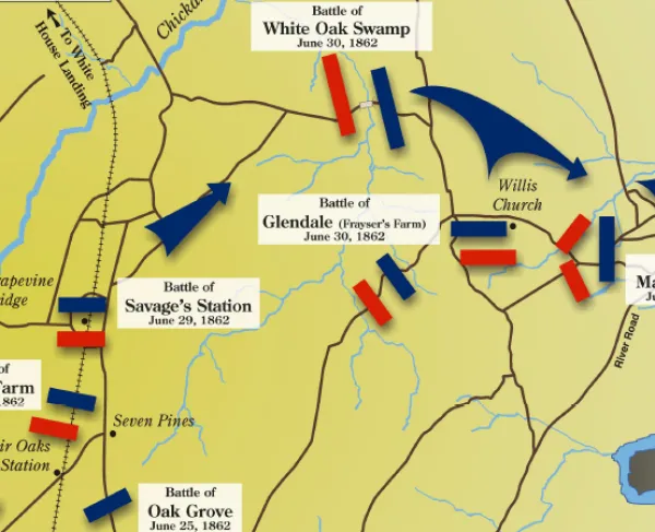 Five of six brigades commanded by Maj. Gen. A. P. Hill advanced through Mechanicsville late on June 26, 1862. Brig. Gen. Roswell Ripley’s brigade from Maj. Gen. D. H. Hill’s division supported the attack. They pushed back Brig. Gen. George A. McCall’s V Corps division of Pennsylvania Reserves all the way across Beaver Dam Creek to join Brig. Gen. George W. Morell’s division. An attack by Brig. Gen. W. Dorsey Pender’s brigade near Ellerson’s Mill briefly broke through the Federal line but was repulsed. Maj. Gen. Thomas J. “Stonewall” Jackson’s division to the north was not engaged.
