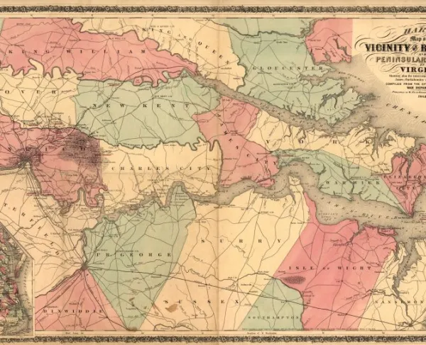 Shows a portion of the peninsula outlined by the York River to the north and the James River to the south. Sneden marked the Union line of march, wagon trains, and Confederate works, all related to the Peninsula Campaign, March-July 1862.