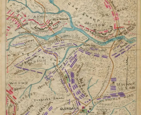 Concerns the Battle of Frazier's Farm, Henrico County, Va., 30 June 1862, variously known as the Battle of Glendale and the Battle of White Oak Swamp. Considered one of the Seven Days' Battles, 26 June-1 July 1862. Map indicates Union and Rebel brigades with lines of cavalry and artillery and shows homes of local residents, churches, and locations of livestock.