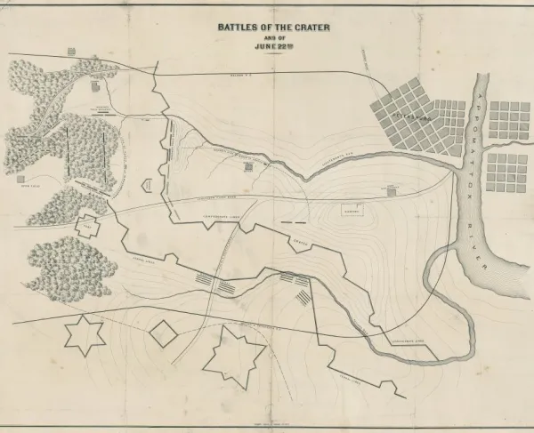 Shows fortifications, camps, roads, railroads, street pattern of Richmond and Petersburg, towns, drainage, vegetation, hachures, and houses.