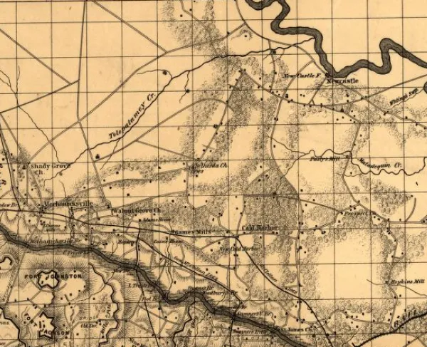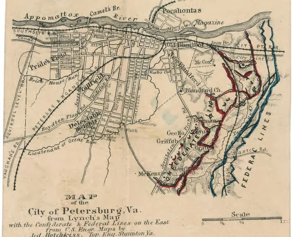 Newspaper map showing "Gen Baldy Smith's line, Wednesday, June 15th," "first line of Rebel works," "line of 2nd & 9th Corps, Thursday & Friday, June 16th and 17," "seocnd [sic] line of Rebel works," and "third line of Rebel works."