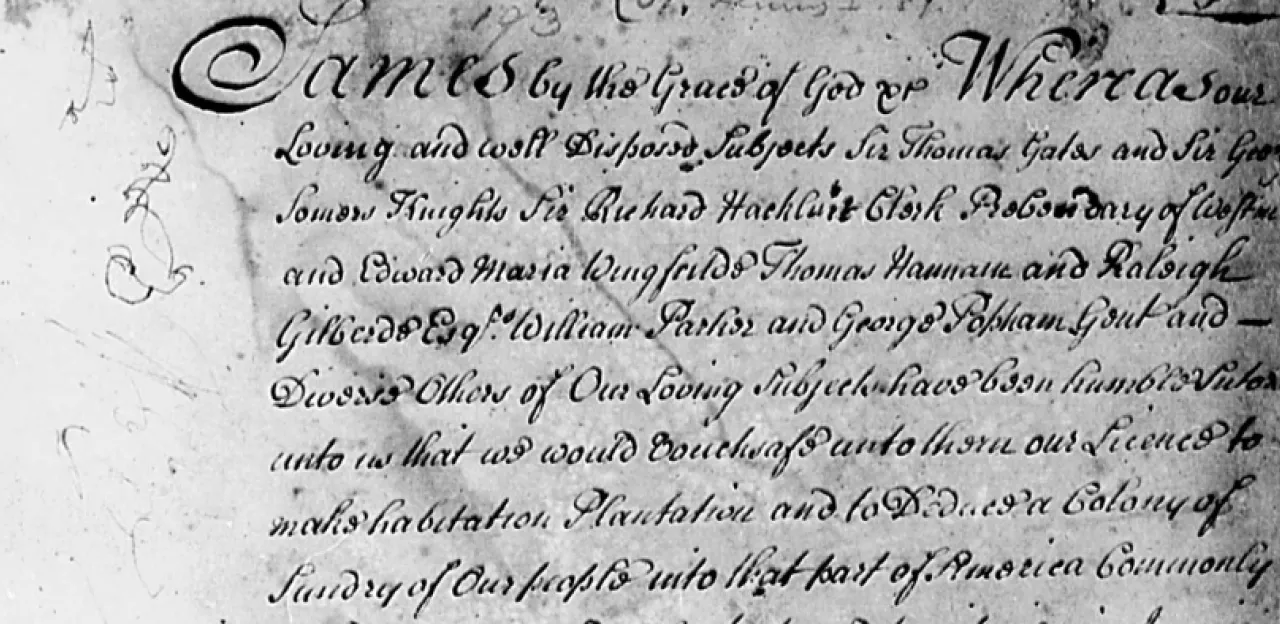 JAMES, by the Grace of God, King of England, Scotland, France and Ireland, Defender of the Faith, &c. WHEREAS our loving and well-disposed Subjects, Sir Thorn as Gales, and Sir George Somers, Knights, Richard Hackluit, Clerk, Prebendary of Westminster, and Edward-Maria Wingfield, Thomas Hanharm and Ralegh Gilbert, Esqrs. William Parker, and George Popham, Gentlemen, and divers others of our loving Subjects, have been humble Suitors unto us, that We would vouchsafe unto them our Licence, to make Habitation, Plantation, and to deduce a colony of sundry of our People into that part of America commonly called VIRGINIA, and other parts and Territories in America, either appertaining unto us, or which are not now actually possessed by any Christian Prince or People, situate, lying, and being all along the Sea Coasts, between four and thirty Degrees of Northerly Latitude from the Equinoctial Line, and five and forty Degrees of the same Latitude, and in the main Land between the same four and thirty and five and forty Degrees, and the Islands "hereunto adjacent, or within one hundred Miles of the Coast thereof;